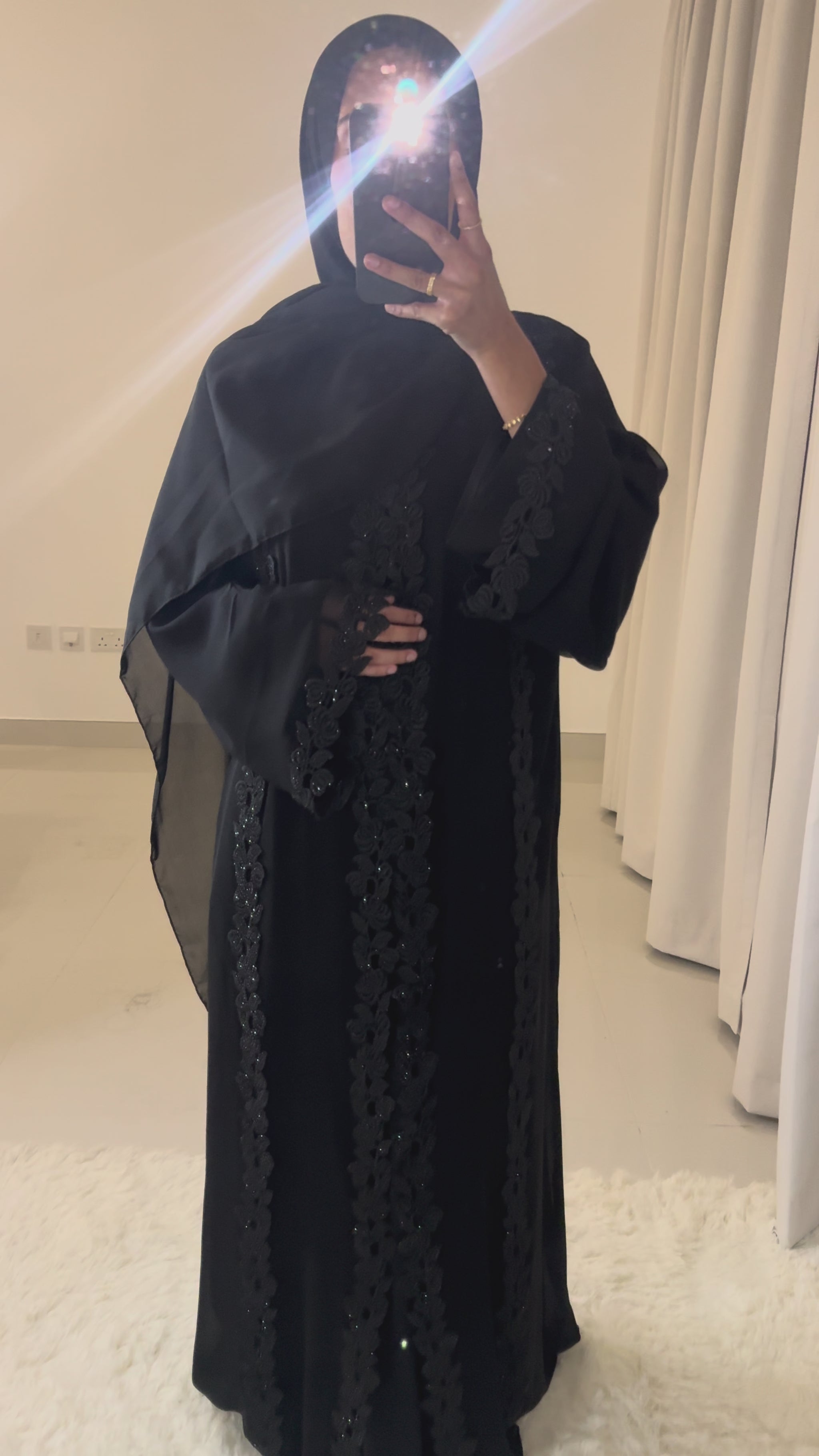 The Azhra Abaya comes complete with a full-sleeve black inner slip, offering modest coverage and a seamless layered finish. The soft movement of the fabric, combined with the intricate embellishments, makes this piece perfect for elegant evenings, seasonal gatherings, or any moment you wish to feel beautifully dressed.