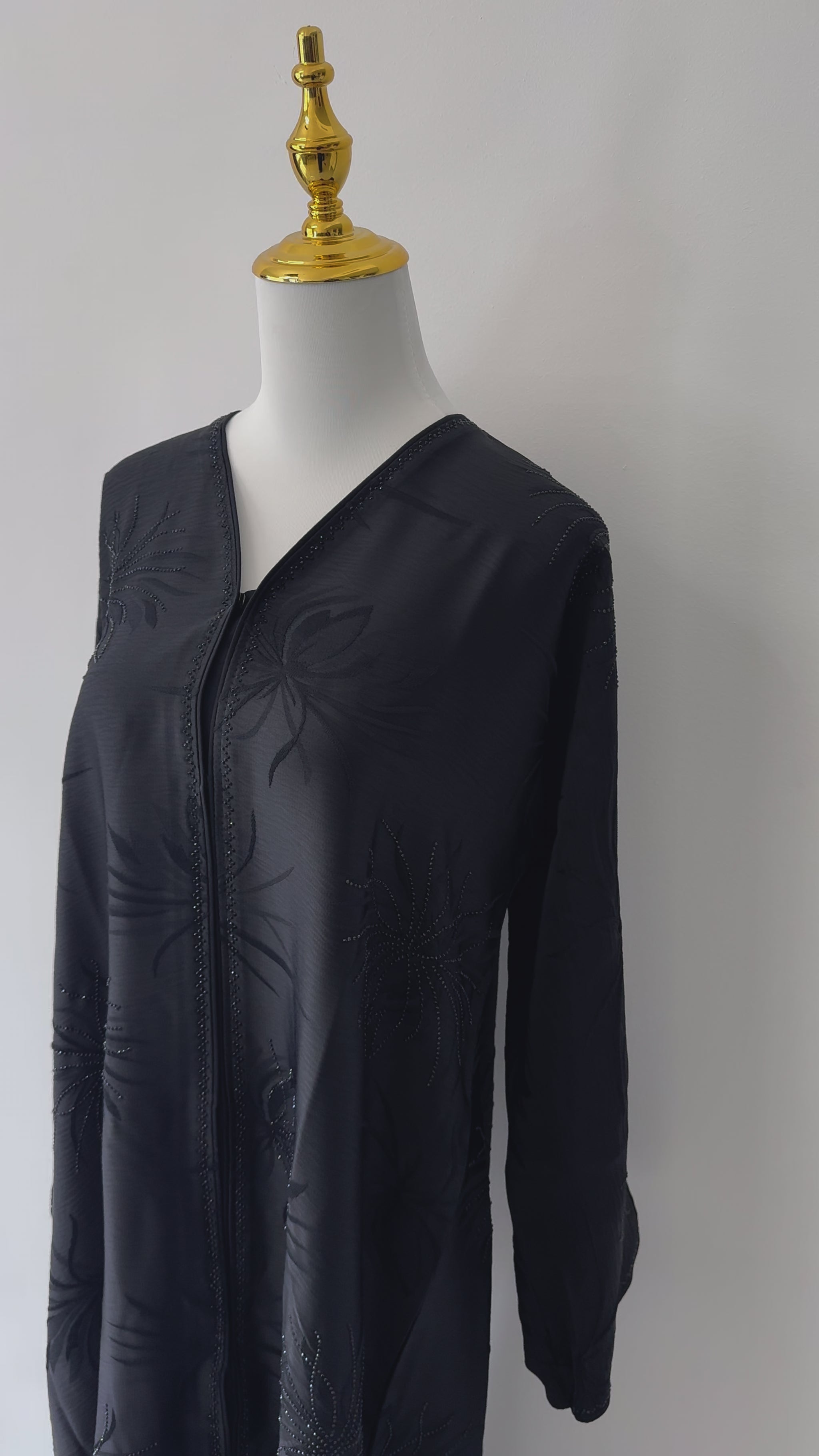 Crafted in a rich, deep black fabric, the Layali Abaya is adorned with intricate, shimmering embroidery that captures the beauty of starlit evenings. The elegant detailing graces the abaya with a subtle sparkle, creating an enchanting silhouette that flows effortlessly with every movement. Designed for the woman who carries timeless sophistication, this piece is both bold and graceful — perfect for intimate gatherings or grand soirées. With a soft inner slip and a beautifully matched headscarf, the Layali Abaya is your invitation to embrace grace, glamour, and quiet luxury.
