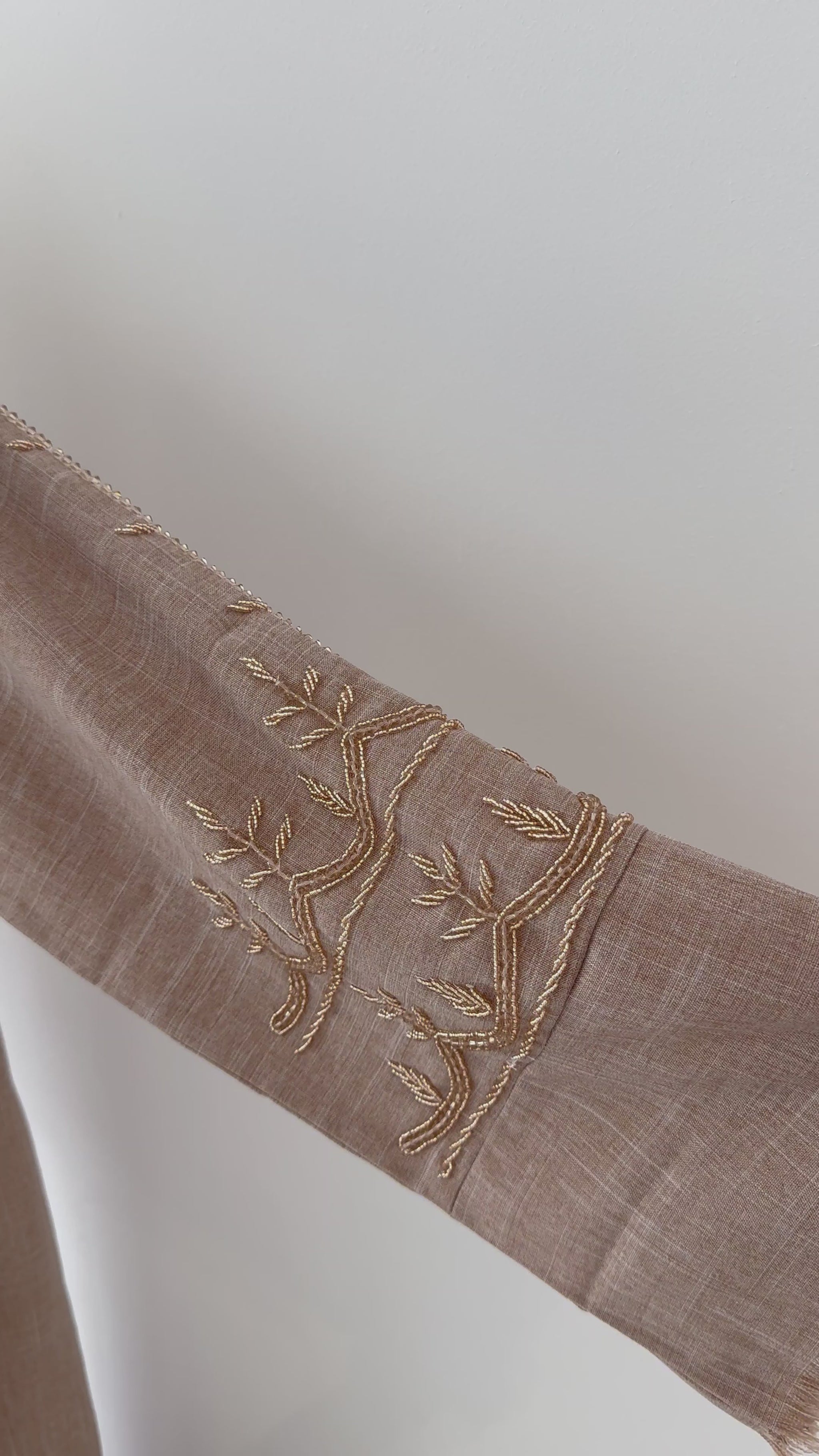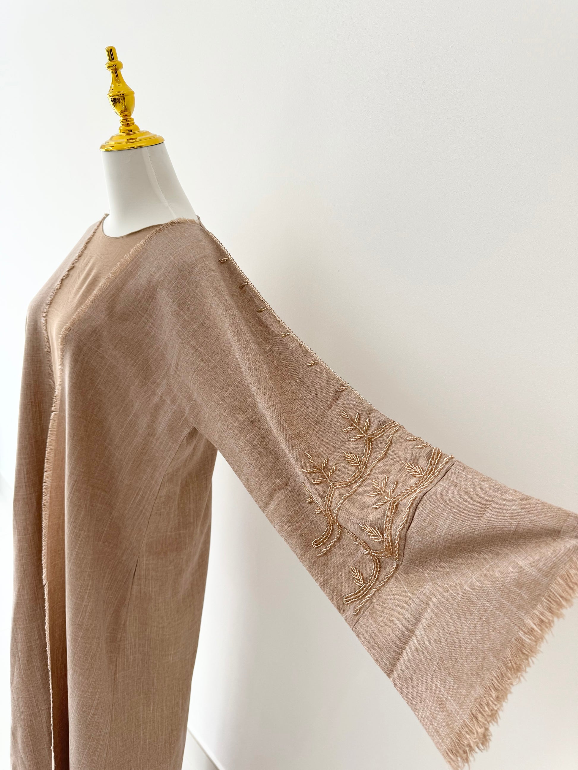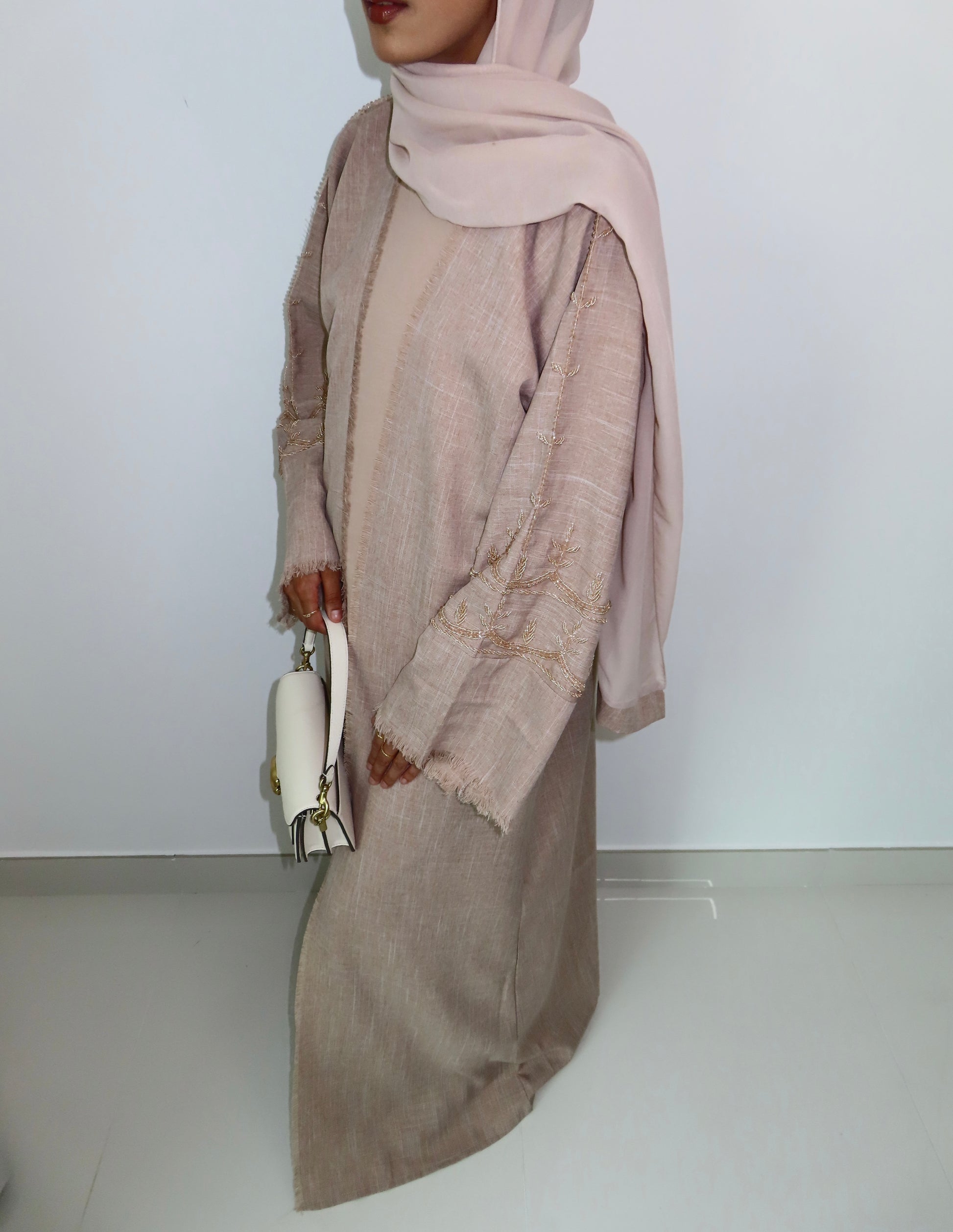 Radiating pure sophistication, the Noor Abaya is a celebration of refined beauty. This three-piece set is meticulously crafted to provide a luxurious drape and a structured yet flowing silhouette. The delicate inner dress offers comfort, while the outer abaya adds a touch of graceful movement, making every step feel poised and elegant. Designed with versatility in mind, the Noor Abaya transitions seamlessly from day to night, from intimate gatherings to grand celebrations. Paired with a beautifully designed matching headscarf and inner sip, this piece is for those who embrace effortless luxury.
